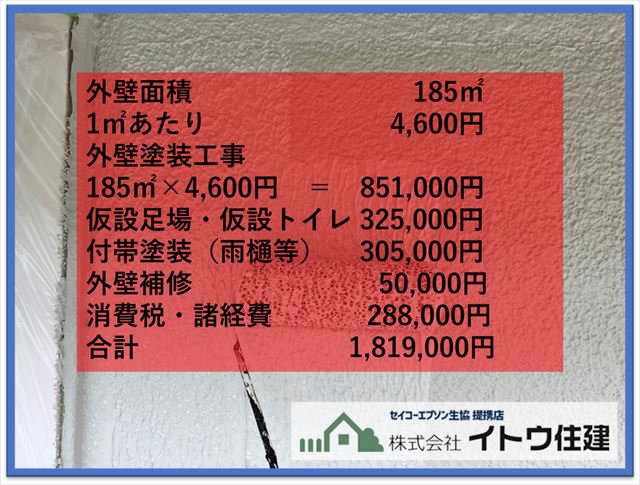 今回の塗装工事のおおよその詳細と総額です。一般的なお家よりも外壁面積が大きかったことと、ドリームコートが若干割り増しになったことで、少々金額が高くなりましたが、塗料の効果はそれ以上のものが期待できます