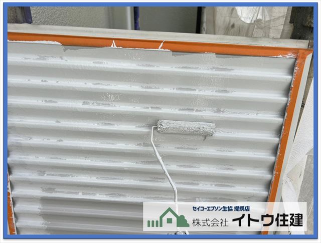 次に中塗りです。中塗りと次の上塗りは同じ塗料を塗装します。使用したのは関西ペイントの外断熱塗料ドリームコートです。従来のシリコン樹脂塗料の5倍の断熱性が期待できる高断熱塗料です。