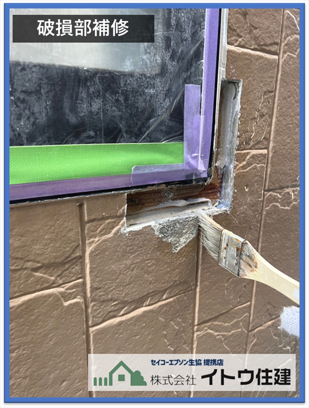お風呂のサッシ下に結露の水が外壁内に入って凍結、融解を繰り返して外壁を痛める凍害、爆裂が起きていました。部分切除をして外壁用補修パテで埋めて補修しておきました。