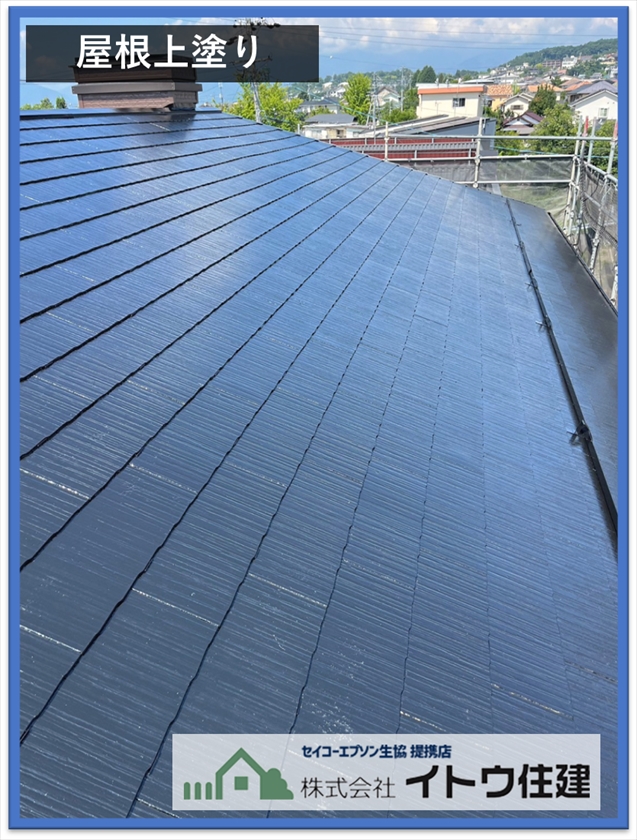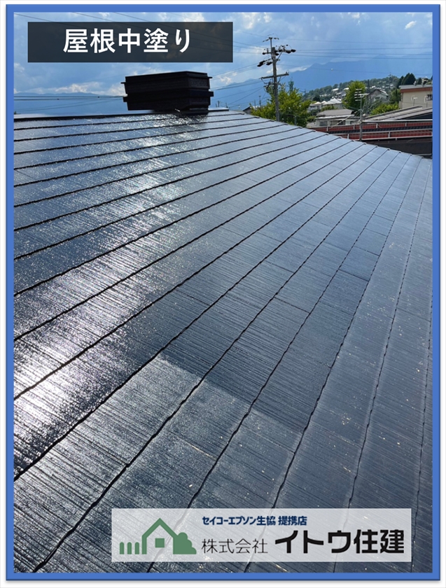 塗装の3工程、下塗りは屋根材の強化と屋根愛と塗料の密着を高めるための塗装です。中塗りは塗料の持つラジカル抑制や遮熱性、防汚性などの機能を塗るための塗装、上塗りは機能とともに色やツヤを出す塗装です。スレートは割れやすいという欠点がありますが、下地強化して塗装しているのでしばらくは大丈夫かと思います。