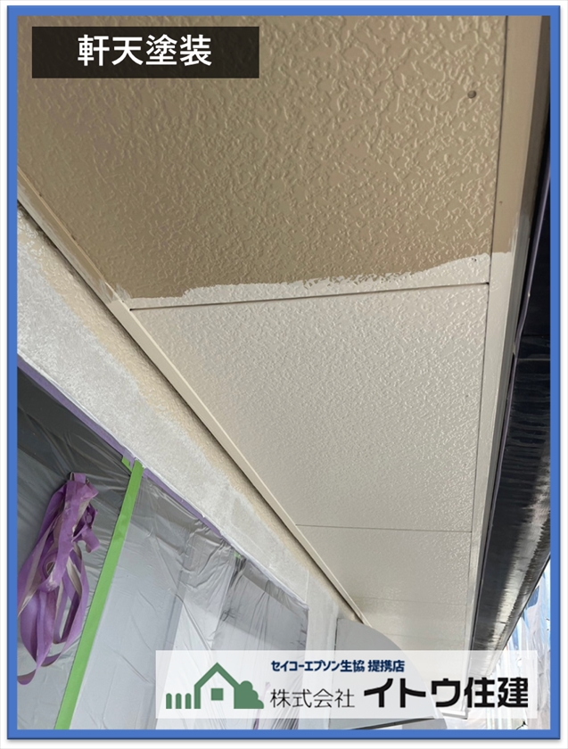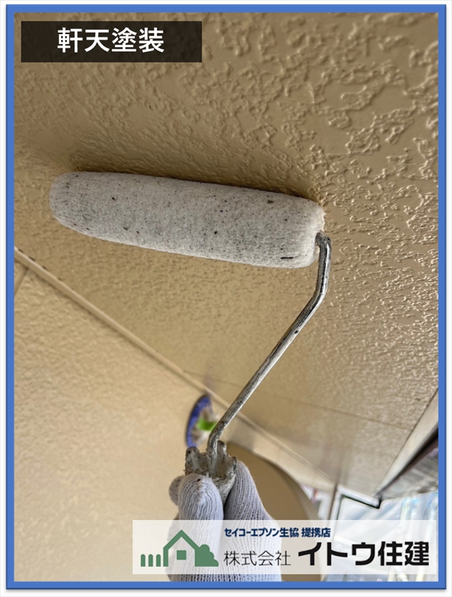 次に外壁塗装の様子ですが、先に軒天の塗装を行います。軒天とは屋根の出の裏側のことです。軒天は水分を排出するところなので、透湿性のある塗料を塗ります。今回使用した塗料は関西ペイントのワイドグリップトいう浸透性のある水性塗料です。軒天塗装は塗装面が下を向いているので、どうしても塗料が垂れてしまいます。垂れた塗料が外壁を汚してもいいように、外壁塗装前に軒天塗装を行います。