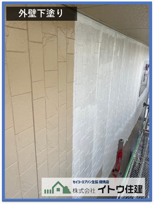 それぞれの工程の役割も屋根と同じです。まずは下塗りをして外壁と塗料の密着を高めます。今回の外壁材は窯業系サイディングです。窯業系サイディングは昼夜の寒暖差や夏冬の寒暖差で伸縮します。その壁材の動きに追随できる弾力性のある下塗りを使用します。使用した塗料は関西ペイントのRSサーフという弾性のある塗料です。