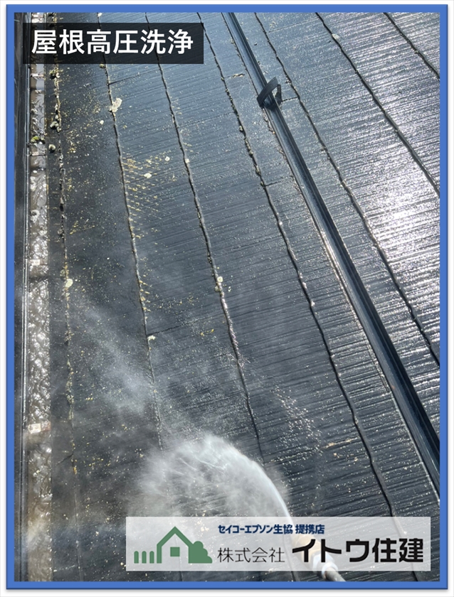 まずは屋根外壁とも高圧洗浄を行います。私たちプロは家電量販店やホームセンター、通信販売などでよく見る電動の高圧洗浄機ではなく、左の写真にあるようなガソリンエンジンの強力な洗浄機を使います。電動の洗浄機だと水圧が足りず、欲しい水圧を出すにはホースを細く絞らなければなりません。ボールペンで紙を塗りつぶすイメージです。ボールペンだときれいに塗れず白い部分が残って塗りムラになるかと思います。ガソリンエンジンの高圧洗浄機はホースを絞ることなくほしい水圧を確保できます。筆で紙を塗りつぶすイメージです。筆なら塗り残しなく塗りつぶすことができると思います。こうして屋根や外壁の塗装面についている汚れなどをきれいに洗い流します。洗浄をしっかりやらないと汚れの上に塗料を塗ることになるのですぐに剥がれるなど不具合につながてしまいます。
