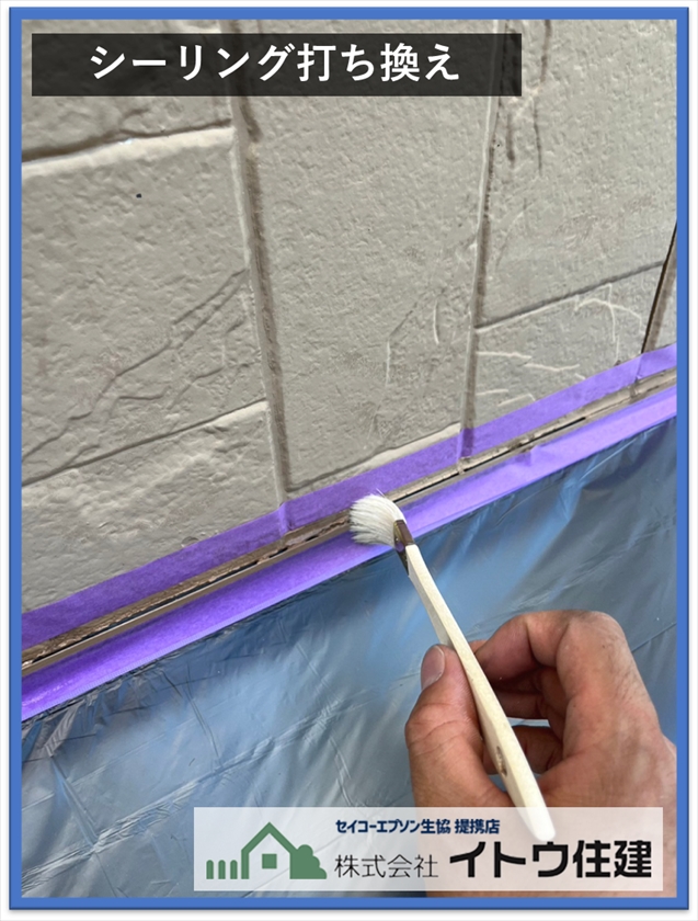 古いシーリング材を撤去して新しいシーリングを打つ打ち替え工事を行いました。外壁に塗装する塗料によって塗装前にシーリングを打つか、塗装後に打つかが決まります。今回は先打ちで行っています。