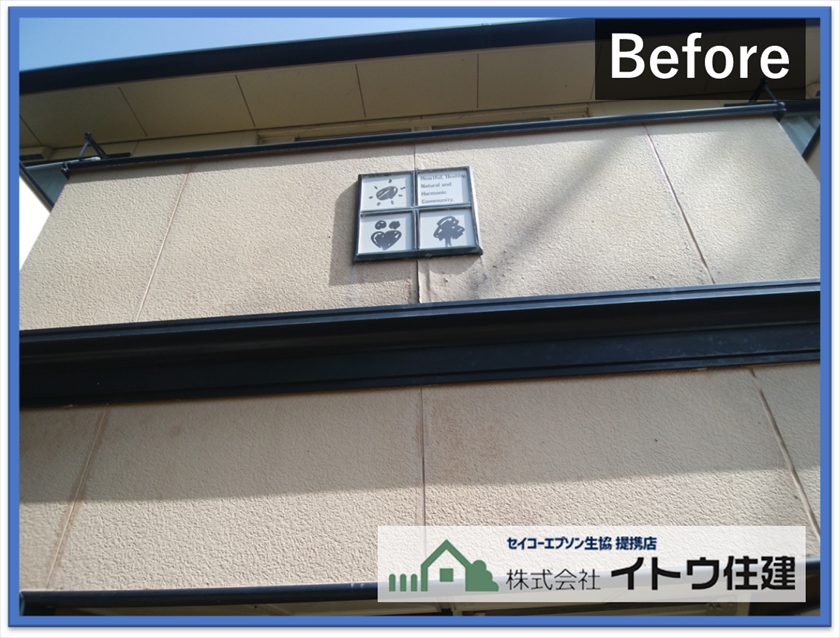 機能と色つやを塗る工程です。今回は一部違う色を塗ってワンポイントアクセントのあるデザインにしました。外壁の色は一度塗ってしまうとやり直しがききません。塗装する前に納得のいく色を選ぶ必要があります。合わせてこのようなデザイン性のある塗装も可能ですので、工事前の色決めの打ち合わせは時間をかけて行わせていただきます。必要があれば施工前の写真に塗装予定の色をのせるイメージ画像をお作りします。それを参考に色をお決めください。