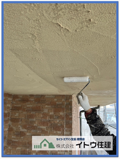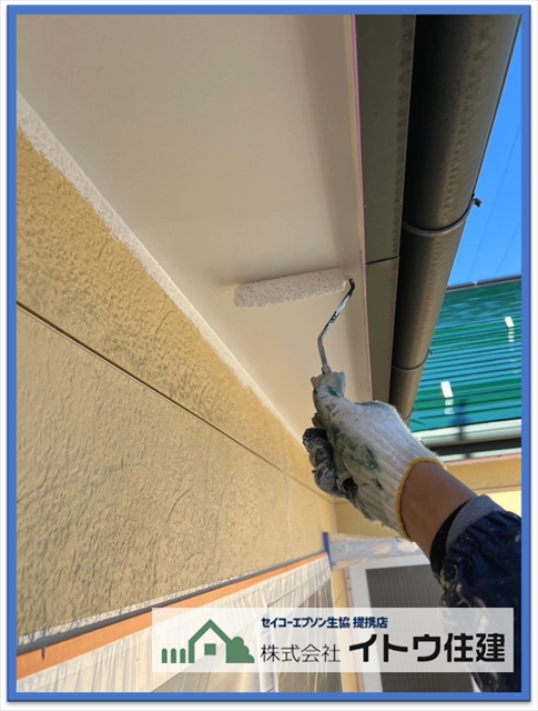 次に外壁塗装の様子ですが、先に軒天の塗装を行います。軒天とは屋根の出の裏側のことです。軒天は水分を排出するところなので、透湿性のある塗料を塗ります。今回使用した塗料は関西ペイントのワイドグリップトいう浸透性のある水性塗料です。軒天は塗装面が下を向いているのでどうしても塗料が垂れてきてしまいます。垂れた塗料で外壁を汚してもいいように外壁を塗装する前に軒天を塗装します。