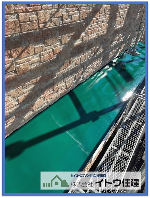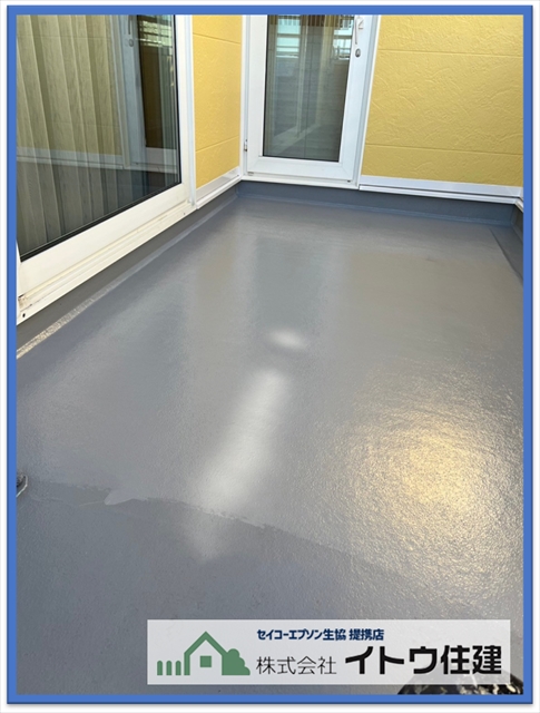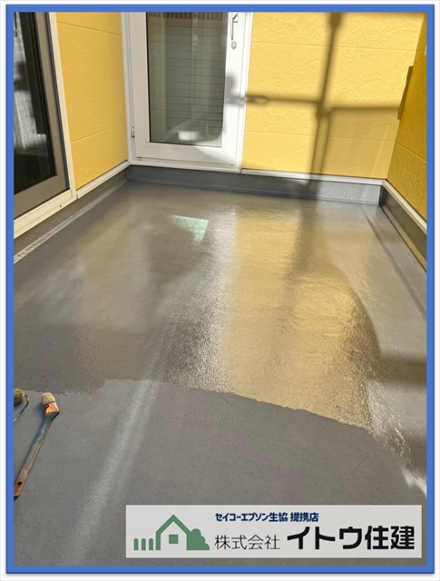 バルコニーの防水塗装も劣化していたので塗り替えておきました。劣化が激しいと防水層を作り直さなければなりませんが、そこまで傷んでいなかったので、防水塗料の塗り替えで済んでいます。