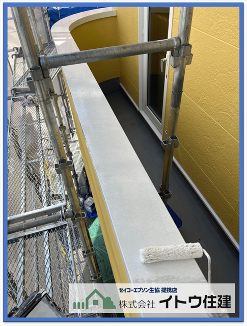 バルコニーの手すりの上場(笠木 かさぎ)もジョイント部分のシーリングを打ち替えて塗装しています。水が入りやすいところなので防水は必須のところです。アルミ製の笠木なので下塗り材にはミッチャクロンという万能下塗り材を使用しています。