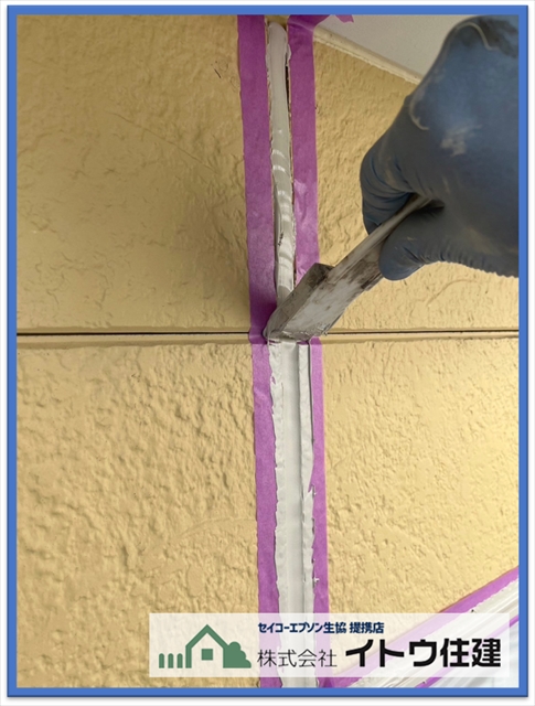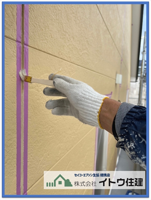 そのあと目地の両端にマスキングテープを貼ってこの後打つシーリング材のはみだしを防ぎ、シーリングの下塗りのプライマーを塗布します。塗装と同じくシーリング材の密着を高めるための塗料です。
