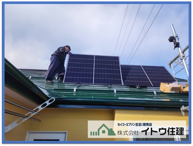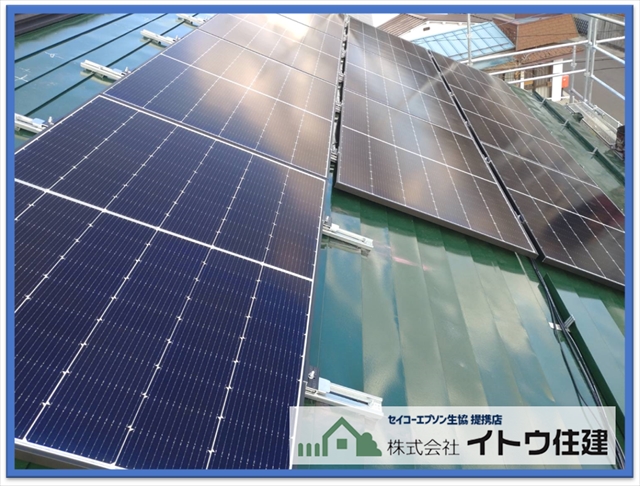 弊社では太陽光パネルの設置設定も行っています。屋根、外壁の塗装がすべて終わったら太陽光パネルを設置しました。
