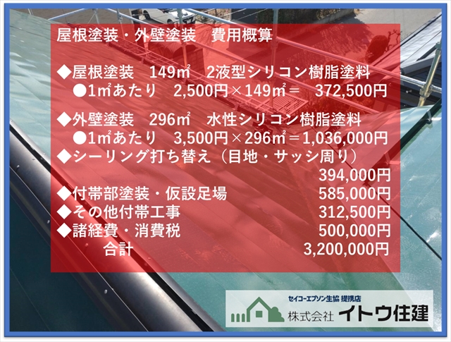 今回行った屋根、外壁塗装工事の費用の概算が上記になります。太陽光パネルの設置は含まれていません。ご自宅の塗装工事の費用の目安にしていただければと思います。