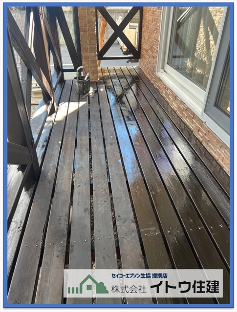 さらにはウッドデッキの塗装も行いました。木製のウッドデッキなので木部専用の塗料です。こちらの塗料は塗装面に塗膜を作る塗料ではなく、気にしみこませて中から木部を保護する塗料です。使用した塗料は和信化学工業のガードラックProです。木部塗料では信頼できる塗料メーカーの塗料です。木が塗料をしみこまなくなるまで何回か塗り重ねます。