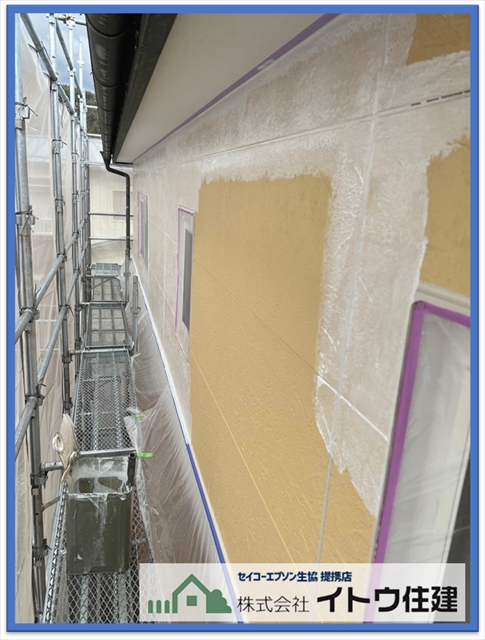 それぞれの工程の役割も屋根と同じです。まずは下塗りをして外壁と塗料の密着を高めます。今回の外壁材は窯業系サイディングです。窯業系サイディングは昼夜の寒暖差や夏冬の寒暖差で伸縮します。その壁材の動きに追随できる弾力性のある下塗りを使用します。使用した塗料は関西ペイントのRSサーフという弾性のある塗料です。